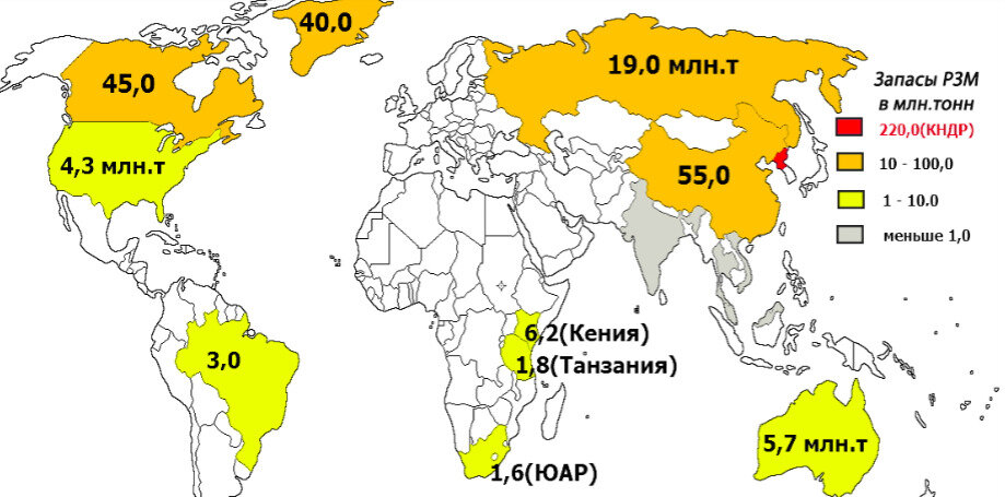 месторождения (3,6% от общих запасов России, низкое содержание РЗМ — 0,04%)